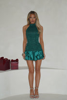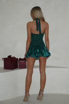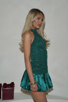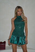 Please note: the outfit may appear less green under studio lighting and flash photography. Both pieces are a true emerald green in person; the images shown reflect how the colour photographs.