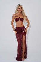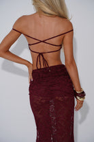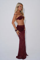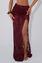 The Lysha Maxi Skirt is made to bring the heat. Designed in stretch lace with a flattering ruched waistband, high-leg split, and statement gold claw hardware at the hip. The fabric is double-layered at the waistband for support.