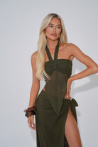 Designed in stretch mesh for a snatched, supportive fit with sheer details. Features a twisted bandeau bust, deep pointed hem, and adjustable halter neck ties.