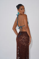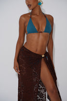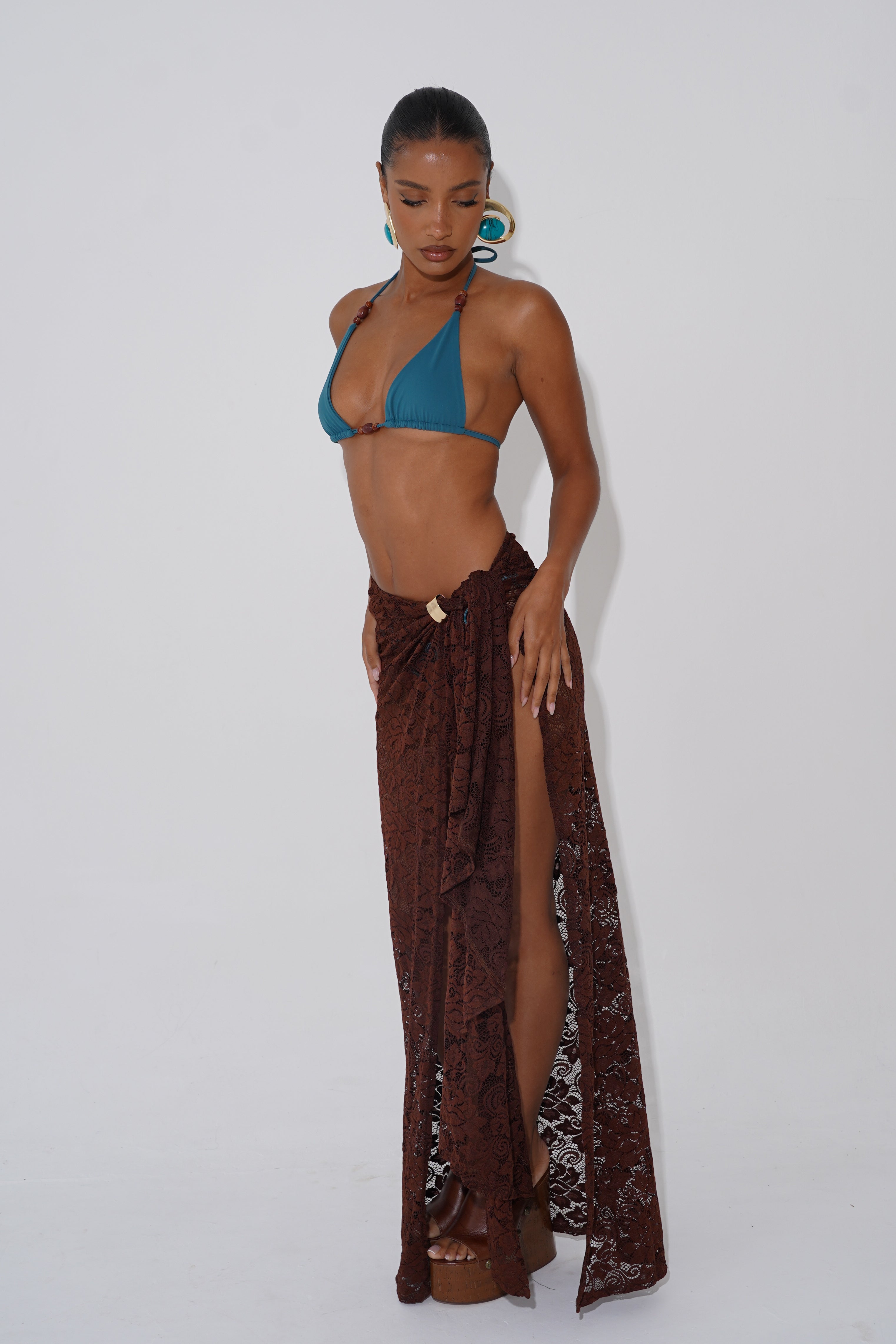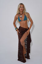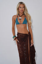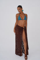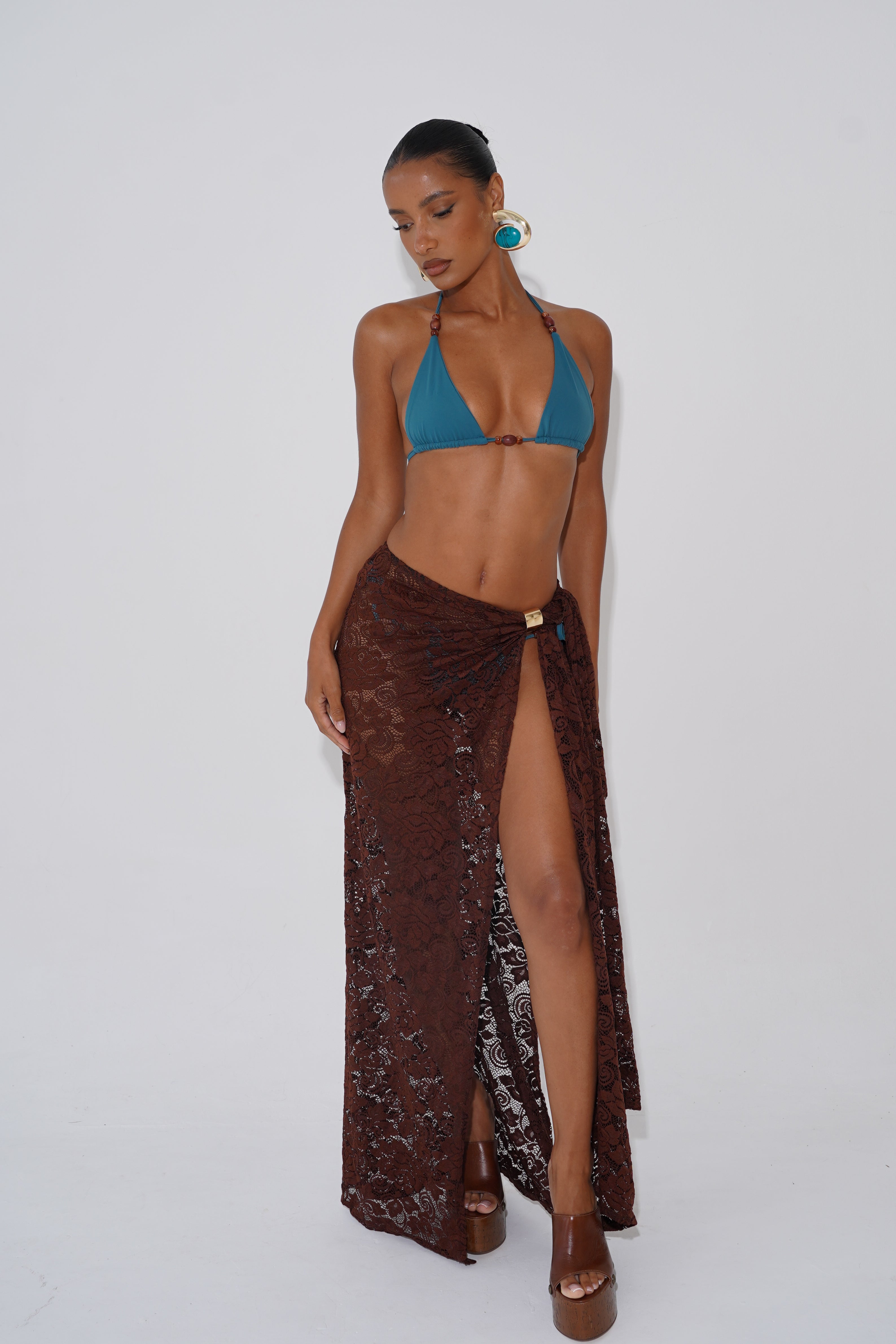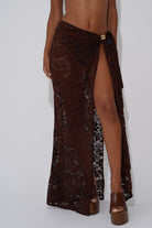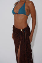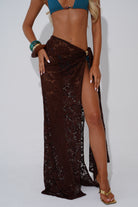 Effortlessly elegant, the Nova Wrap Skirt is designed in rich chocolate-brown floral lace that drapes beautifully across the body. Complete with a luxe gold hardware accent at the waist, its adjustable tie and thigh-high split offer a flattering, custom fit. Lightweight and semi-sheer, this piece is perfect for layering over your favourite bikini or pairing with heels for sunset drinks.