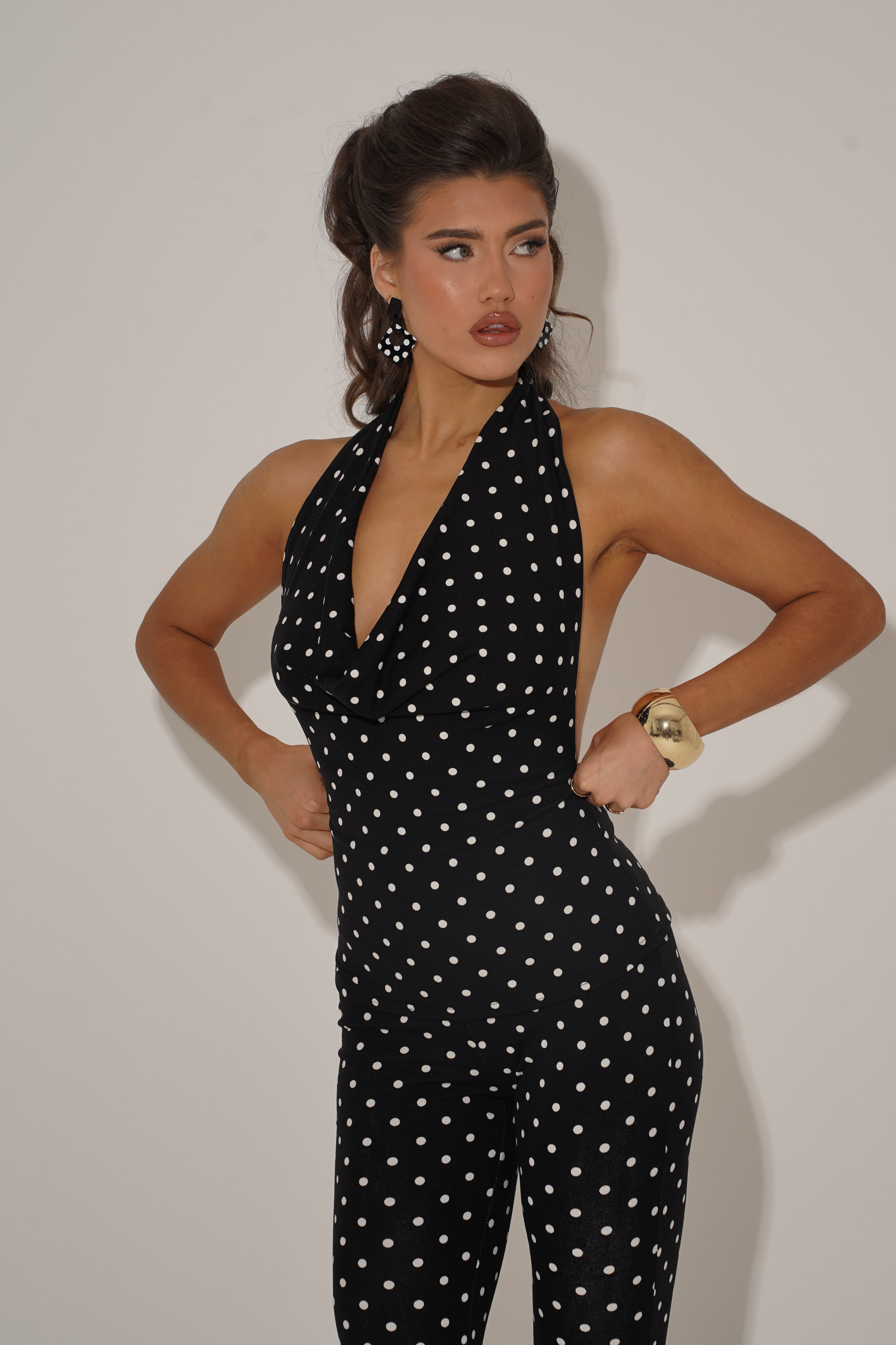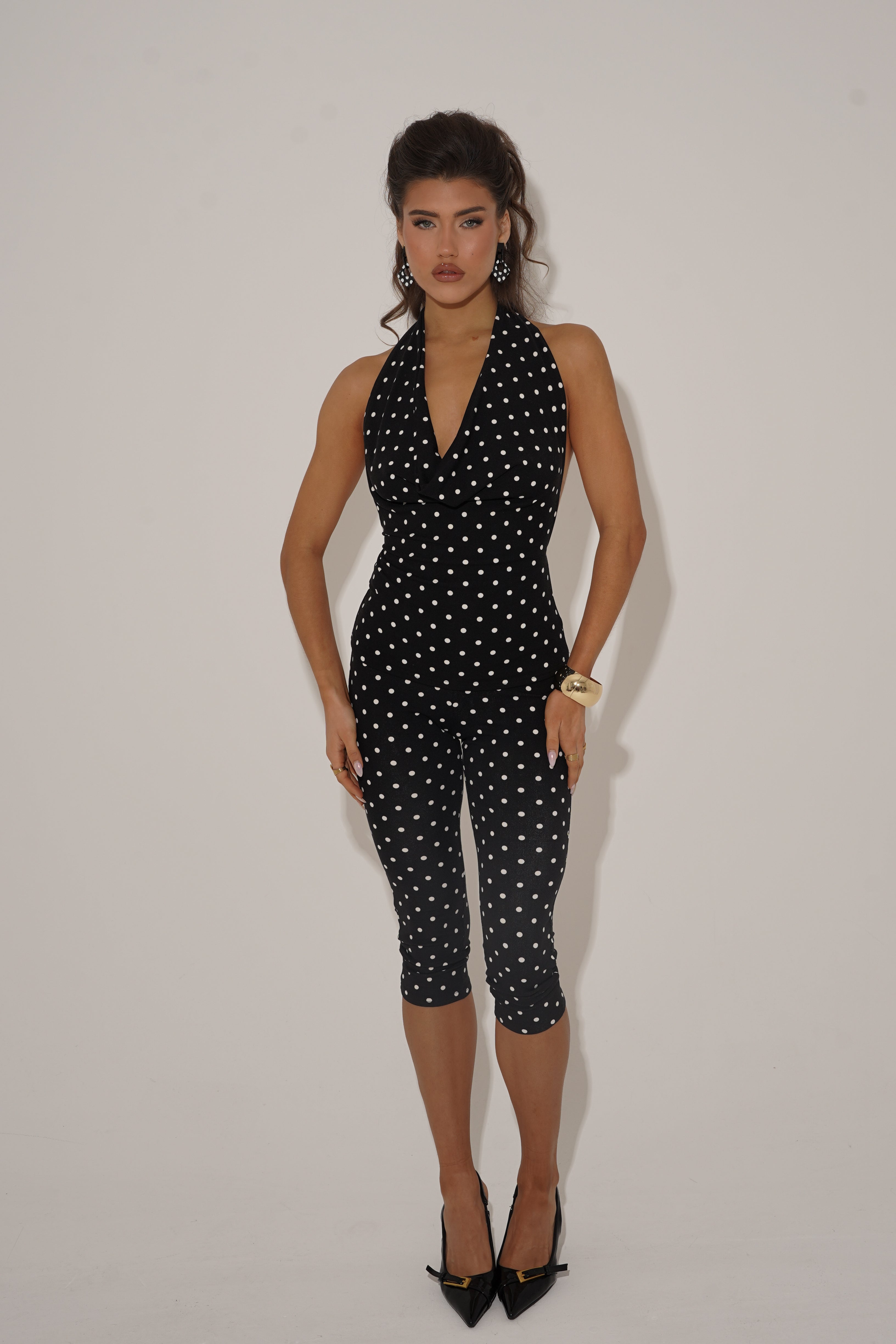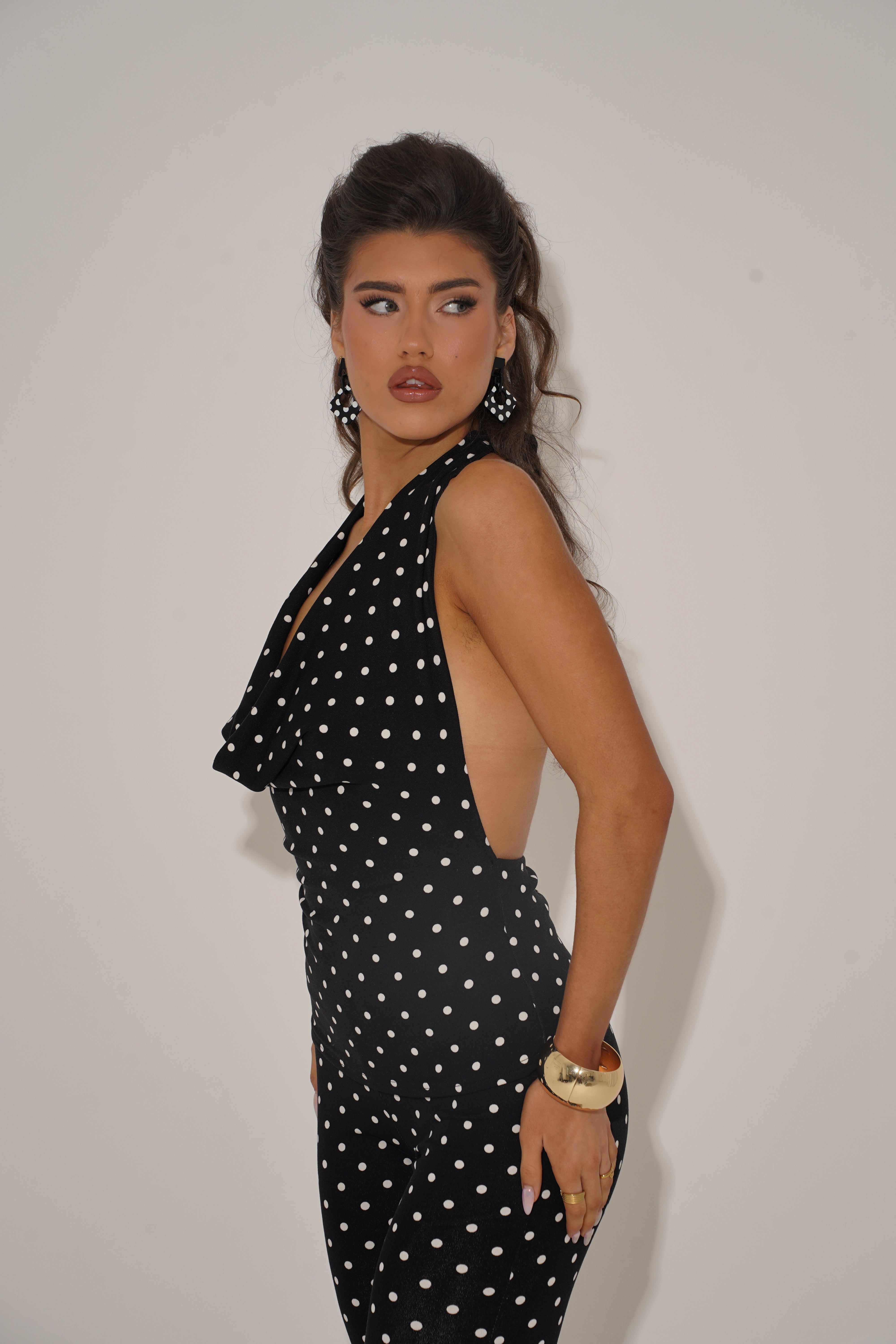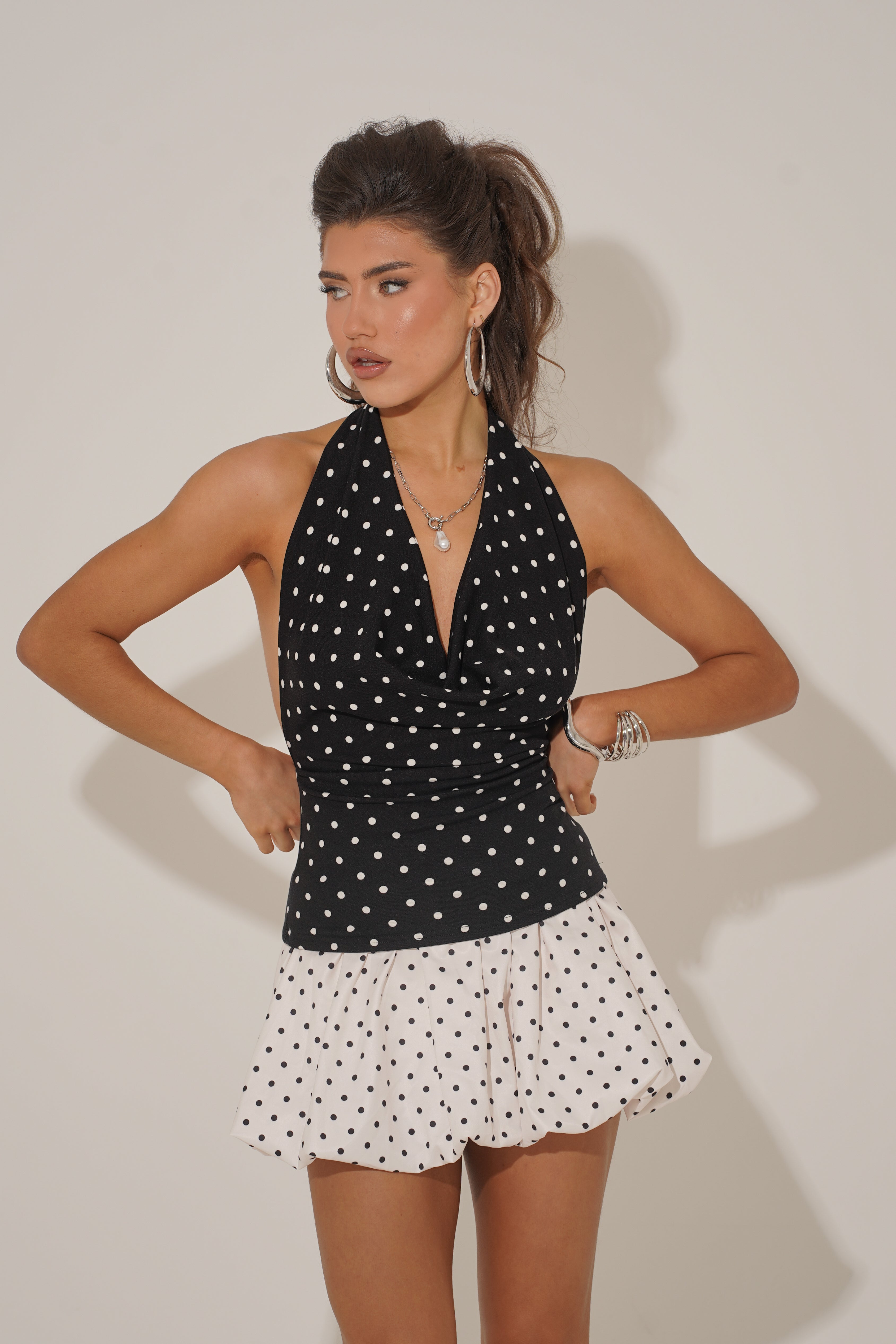 Designed with a halter neckline, cowl drape and an open back with adjustable ties, it’s a flattering, playful piece that channels classic 60s femininity. Finished in timeless black-and-white polka dots, it’s the ultimate statement top for everything from day parties to late-night plans.