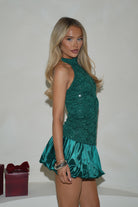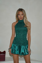 Please note: the outfit may appear less green under studio lighting and flash photography. Both pieces are a true emerald green in person; the images shown reflect how the colour photographs.